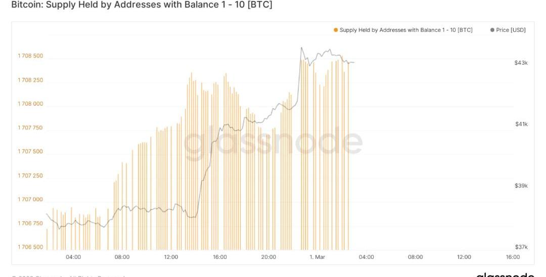 XRP/HKD-1.46%原文作者:PhyrexNi原文來源:Medium從昨天晚上開始BTC進入瘋狂的領漲模式,一直持續到早晨八點,其中一度沖破了44,000美金,雖然目前已經回調到43,000美金左右,但是24小時內將近15%的上漲,而且還是領漲還是蠻可怕的,那么是什么原因或者說是什么樣的情況才導致了BTC的如此上漲,咱們通過數據來看一看,誰買走了你的BTC?到底誰是這次的主要買家,目前廣泛流傳的說法是因為俄羅斯的被制裁導致了外匯兌換的限制,法幣的貶值以及提現的困難,這并不僅僅是發生在俄羅斯,包括遷徙家園的烏克蘭民眾也會受到法幣的沖擊,所以BTC承擔起了“避險資產”的作用,一方面是相對底部的價格導致下行空間并不多,另一方面兌換美金會簡單。