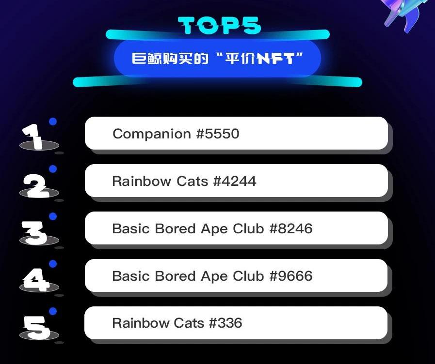 過去24小時,巨鯨購買的“平價NFT”中排前五的分別是:Companion#5550、RainbowCats#4244、BasicBoredApeClub#8246、BasicBoredApeClub#9666和RainbowCats#336。