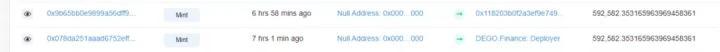 我們以ETH鏈上攻擊為例,對Dego項目方其中一個地址的資金流向做了詳細分析。首先,項目方私鑰泄露的DEGO.Finance:Deployer地址為:0x20FE4B1eD95911487499e53355BB8f14a881D735攻擊者地址為:0x118203B0f2A3ef9e749D871C8fEF5e5e55ef5C911攻擊者通過私鑰,使用minter權限分別向DEGO.Finance:Deployer賬戶和0x118賬戶鑄造了592,582.35個dego代幣。