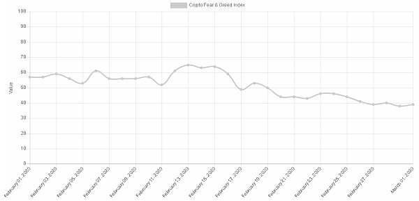 本周比特幣波動率指數沖高回落,開盤值1.22,最高值4.34,最低值1.13,收盤值2.08,收盤值較上周同期上漲70.49%,伴隨大盤大幅回調波動率加劇。恐懼&貪婪指數7日前為46點,本周最高為46點,最低為38點,恐懼&貪婪指數最新點位39,較上周同期46點下降7點,市場恐懼情緒有所增強。