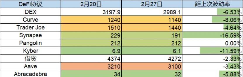 本周ETH鏈占比出現歷史最小情況,從上周的58.63%進一步下跌至54.8%,占比下跌幅度達3.83%,也是自21年9月初以來單周下降幅度最大,于此同時,Terra鏈占比由7.92%上升至9.87%,單周增長1.95%,出現最大單周增長情況。其余鏈變化較小。ETH鎖倉量情況