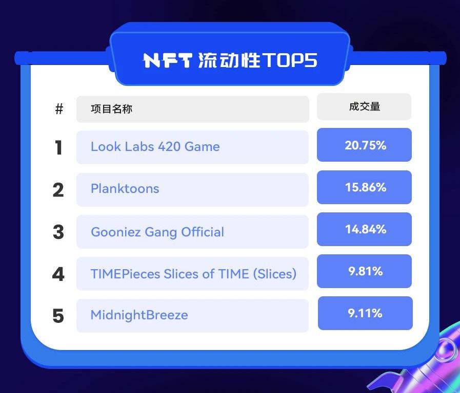 按過去24小時流動性指標,排名前五的項目分別為LookLabs420Game、Planktoons、GooniezGangOfficial、TIMEPiecesSlicesofTIME(Slices)和MidnightBreeze。