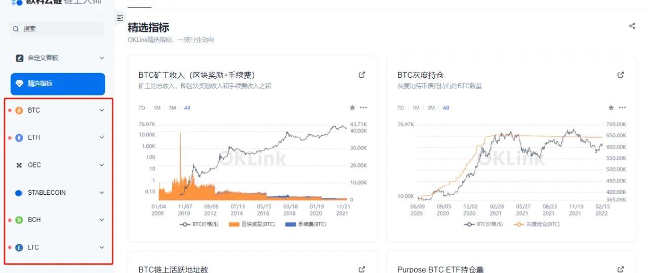 返回鏈上大師頁面最上方,點擊“開始體驗”,我們就來到了鏈上大師數據看板頁面,這里可直觀感受多個精選指標變化趨勢。目前鏈上大師已涵蓋BTC、ETH、OEC、BCH和LTC等在內的十余條公鏈和10000+數據指標,以多生態角色和多維度的形式為用戶展現完整詳實的鏈上數據生態。