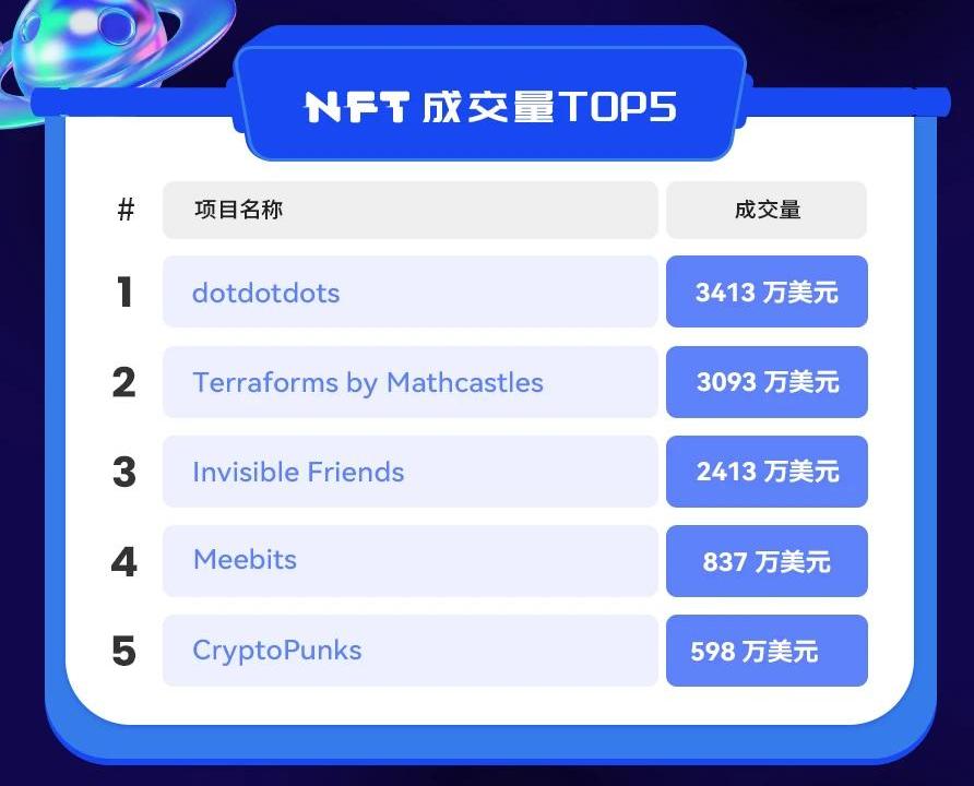 按過去24小時成交量,排名前五的項目分別為dotdotdots、TerraformsbyMathcastles、InvisibleFriends、Meebits和CryptoPunks。