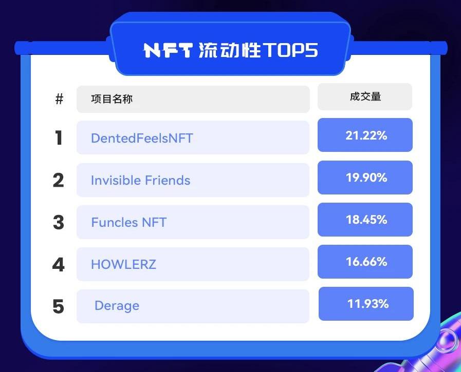 按過去24小時流動性指標,排名前五的項目分別為DentedFeelsNFT、InvisibleFriends、FunclesNFT、HOWLERZ和Derage。