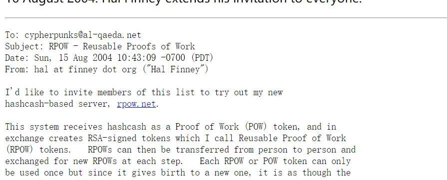 2004年,HalFinney借鑒了AdamBack的Hashcash,創建了RPoW;