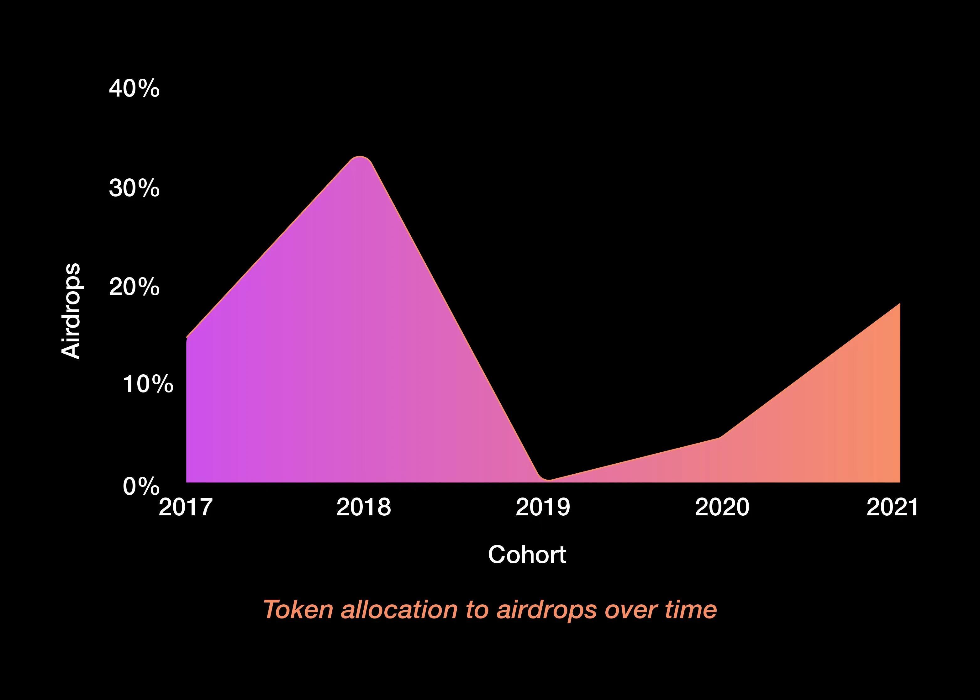 這部分代幣獎勵過去的用戶增值行動。空投一開始是有流動性的,可根據核心團隊設計的每個地址的預先設置分配來申請。空投在2017年期間越來越受歡迎,并在2018年達到頂峰。經過短暫的冷卻期后,空投分發代幣比例近年來有所增加,從2019年的近0%增至2021年的15%。