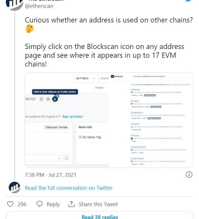 7月,EVM多鏈用戶可以通過Etherscan區塊瀏覽器輕易地查看某條鏈上的地址是否也在另一條鏈上使用。