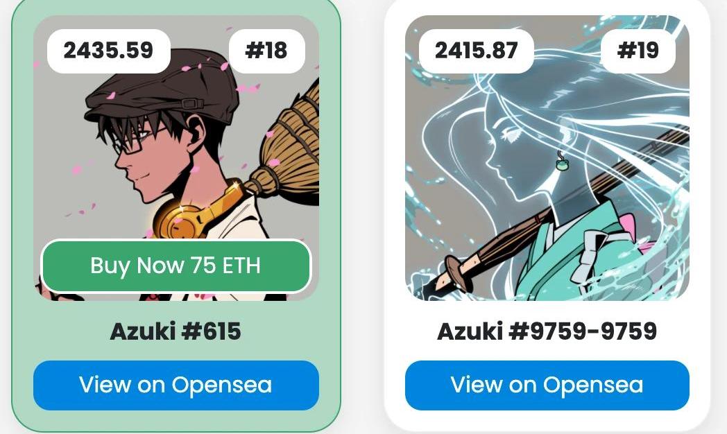 實際上,大部分NFT也是參考這樣的排序方式。所以你可以看到很多簡單的款式都排在每個系列的前面。這只猴因為沒有衣服、沒有飾品,和相對稀有的背景色、眼睛,排在了第二名。但對于大部分買高價NFT彰顯身份的大戶來說,買這只所謂排名第二的猴可能還不如買金皮膚、鐳射眼,這些帶有具備高識別度的顯性元素的猴。用我自己的話說是“把稀有度用在刀刃上”。例如下圖中兩個在排名網站上分別位列18、19名的Azuki,真實的市場價值一定是后者高很多。因為后者的Type是Spirit,這種十米開外就能看出來稀有的元素,肯定比前者更受歡迎。