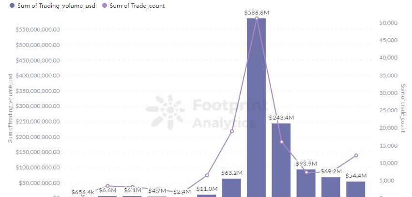 FootprintAnalytics-AXSPrice生成藝術品項目ArtBlocks的交易額也在8月份達到了$5.87億的歷史最高值,交易人數突破了2萬,無論從銷量還是人氣上,都成為了當之無愧的NFT第一藝術股。