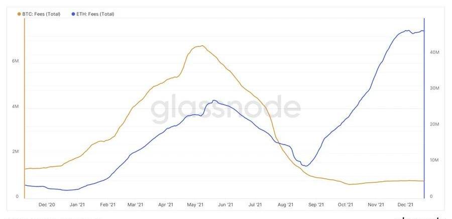 17、另一方面,由于高gas持續存在,以太坊礦工收入水漲船高;在2021年的大部分時間里,他們的總費用收入高于比特幣礦工。隨著2022年的以太坊合并到來,驗證者將獲得MEV和費用+通貨膨脹獎勵。