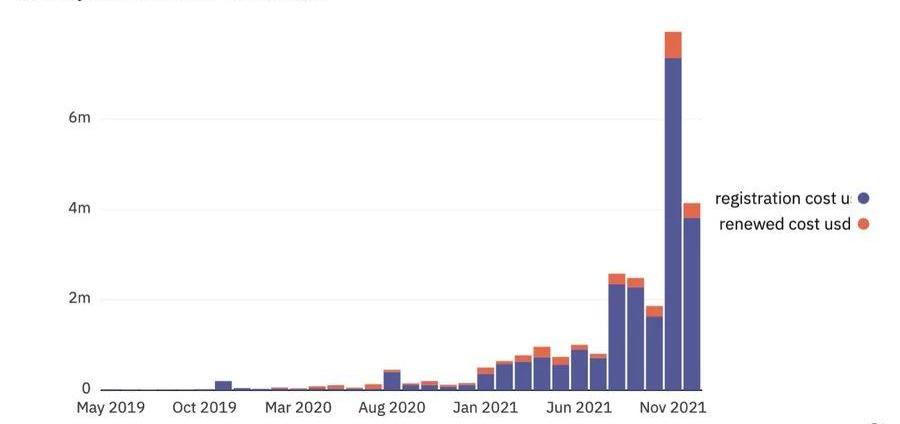 65、ENS在2021年11月的某個時候下放了對其用戶群的全部責任。此后不久,.eth的注冊量比前5個月的平均值增加了一倍多。