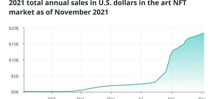 2021年,NFT逐漸拓展到了多個垂直領域,而且交易量增長極快。數據不會說謊——截至2021年第四季度,NFT收藏品和藝術品的銷售總額已經達到74億美元。從2021年1月1日開始到11月5日,NFT藝術品市場的銷售總額已從1,780萬美元增長到18億美元。從2021年初至今,NFT收藏品市場的銷售總額也從5550萬美元飆升至56億美元。另據路透社報道,NFT銷售總額從第二季度的13億美元躍升至第三季度的107億美元。今年4月,首次在蘇富比進行拍賣的NFT藝術家Pak以1680萬美元的價格拍出了自己的作品;緊接著,佳士得有以6900萬美元的價格拍出了藝術家Beeple的NFT作品。
