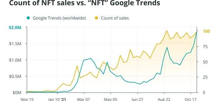 2021年4月,藝術和數據科學博客Artnome發文稱:加密藝術平臺SuperRare上注冊收藏家的瀏覽次數與該平臺上的NFT銷售價格之間存在相關性,“炒作機器是真實存在的”,因為數據顯示,只要注冊收藏家訪問一件NFT作品的次數越多,該NFT作品的銷售價格就會被推動得越高。今年的NFT市場出現了兩次飆升,巧合的是,在這兩次時間點上,“NFT”一詞在互聯網上的搜索量猛增——