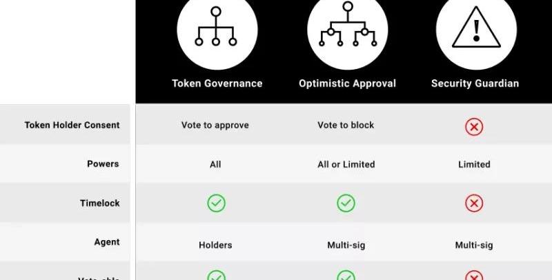 治理使現代社會成為可能。政府決定將稅收收入分配到哪里,并影響控制經濟價值流動的杠桿。但這是過去的做派。區塊鏈技術使得這些行為在公開地方進行——將受影響的公民置于決策的最前沿。去中心化自治組織是控制大量資源的鏈上政府。這些有可能通過合約激勵機制消除腐敗。換句話說,“不能作惡”遠比“不作惡”強大得多。即使谷歌和世界各國政府沒有作惡的意圖,但是他們都有作惡的能力。只有開源治理算法才能幫助人類進化到更高層次的協調。許多DAO一直在努力創建平衡敏捷性和安全性的治理流程。開發人員需要快速構建和迭代產品,而不是每次發布代碼時首先進行冗長的爭論,而社區需要具有阻止不良行為者的能力。下面是一個框架模型:采用多種治理策略來最大限度地提高開發速度同時保證協議安全。未來的DAOs將利用三個主要類別的微治理權利:1、代幣治理——具有類“行政部門”權力的直接民主2、樂觀治理——具有類“立法分支”權力的代議制民主3、安全衛士——具有一定條件下的類“司法部門”的權力