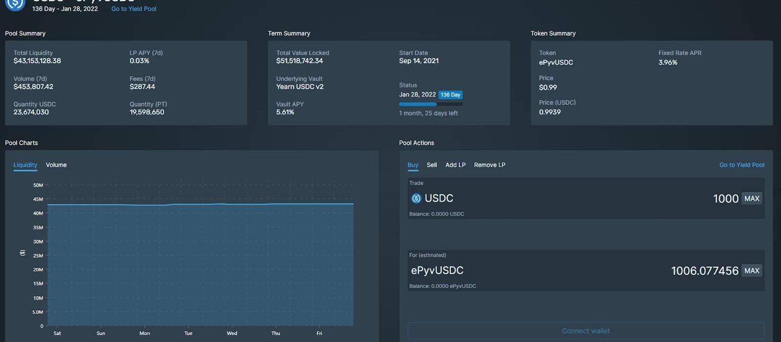 來源:ElementFinance例如用戶用1000個USDC進行購買,將會獲得約1006.078個PT。等到2022年1月28日到期時,用戶可以用手上的1006.078個PT1:1的換成USDC從而賺取6.078USDC的利息,此時的固定APR為3.96%。想要了解更多信息,可以通過Pools的界面進入,選擇對應的池子。在PoolActions中同樣可以直接使用USDC購買PT。