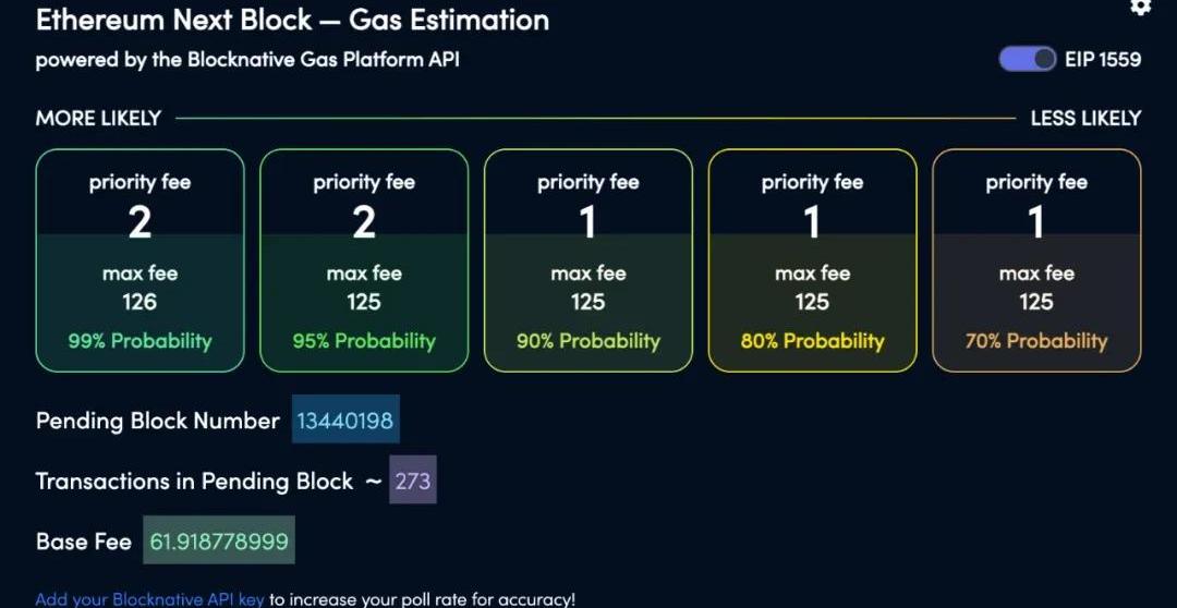對于數據類API服務的話,就更多了,收費或免費的都有。其中最常用的是ETHGasStation、Etherscan或Blocknative等。這些數據API都支持最常見的HTTP調用,通過iOS的快捷指令或者Python都可以相當容易的調用并獲得數據。但是至于這些服務的預測準確度來說,有待更多時間的觀察。