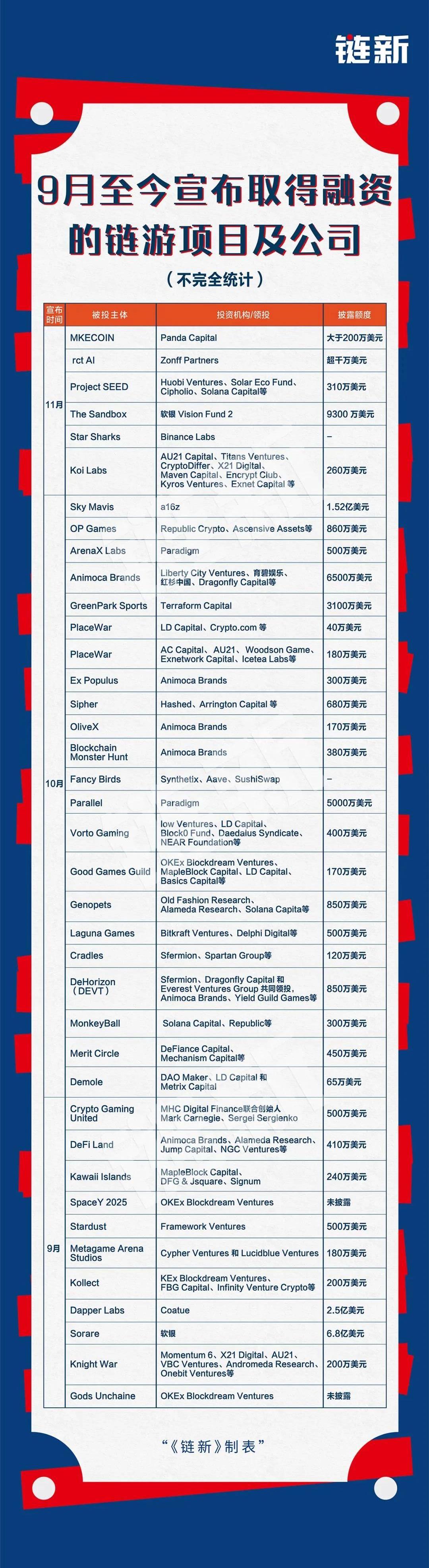在AxieInfinity取得成功前,大眾對鏈游的印象停留在2017年的加密貓游戲上。由于加密貓游戲爆發持續的時間很短,無論是區塊鏈行業還是游戲行業,鏈游當時都只是一個相對冷門和小眾的市場。鏈游的冷啟動源自NFT概念的爆紅,而AxieInfinity讓市場看到了區塊鏈游戲特有的商業模式,即P2E,邊玩玩賺經濟模式的可行。與P2E是相對的,是傳統游戲行業里市場覆蓋率最高的的F2P模式,即玩家前期可以免費玩游戲,但后期若需獲得更好的游戲體驗則需要充值。F2P模式最成功的代表是中國國內的網游,也正是因為中國的網絡游戲發展成熟,國內的游戲大廠開始從出海、3A大作等方向上謀求新的增長點。優秀的3A游戲歷來主要出現在北美,而實際上歐美游戲大廠近幾年才開始嘗到F2E的甜頭,游戲廠商對于玩家過度壓榨的新聞在全球都屢見不鮮。AxieInfinity于2018年上線,直到在疫情期間為菲律賓玩家帶來了游戲打金的收入,才迅速成為以太坊上的知名項目。知名NFT投資人AndrewSteinwold曾一度擔憂P2E會吹大NFT的泡沫——該商業模式或許會在游戲行業占有一席之地,但并非是P2E之后游戲行業的下一個方向。然而,AxieInfinity熱度不減,在今年8月單月創收入超過傳統頂級手游《王者榮耀》7月單月的收入,AxieInfinity以自身的成長扭轉了投資人的看法,甚至引起了傳統風險投資的興趣。據《鏈新》不完全統計,自9月以來,約40個區塊鏈游戲類項目宣布取得融資,融資總額逾14.6億美元。數據顯示,10月的融資密度明顯高于9月。9月,以太坊的夢幻足球游戲Sorare宣布獲得6.8億美元,領投者為軟銀;NBATopShot的開發公司DapperLabs完成2.5億美元融資,由對沖基金CoatueManagement領投。這是該月宣布取得融資金額最大的兩筆。10月,超20個區塊鏈游戲類項目宣布取得融資。這些取得融資的項目覆蓋了底層協議、游戲開發商、游戲項目以及游戲公會,均為NFT項目,且以P2E鏈游為主。而積極入局的投資機構,除了PandaCapital、Paradigm、DelphiDigital等區塊鏈風險投資機構,還包括紅杉中國、育碧娛樂等傳統風險基金及游戲公司。值得注意的是,SkyMavis和TheSandbox分別宣布取得了1.52億美元、9300萬美元的融資,主要投資機構分別對應A16Z和軟銀VisionFund2。SkyMavis為AxieInfinity的開發公司,TheSandbox則是最大的區塊鏈虛擬土地經濟游戲。