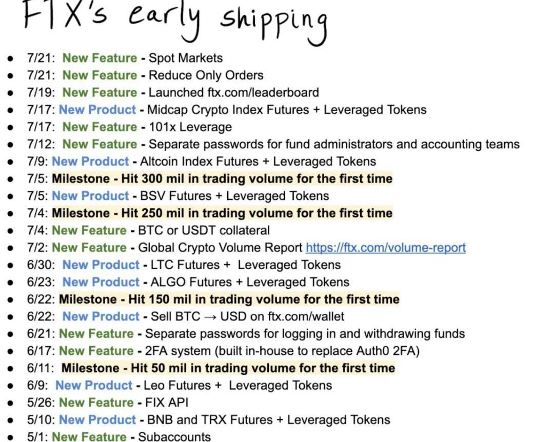 去年8月,FTX收購了Blockfolio,一個加密貨幣新聞和投資組合跟蹤的應用程序,我們稍后會展開。FTX提供自己的代幣:FTT。與Binance的BNB一樣,FTT提供交易手續費折扣、投票權、NFT獎勵、空投獎勵,也可用來滿足賬戶的抵押品要求。為了保持稀缺性并創造價格壓力,FTX自己'買入并燒毀'FTT。Serum則是由FTX和Alameda創立的去中心化交易所。與Uniswap或Sushiswap等DEX不同,Serum建立在Solana之上,這意味著交易系統擁有更快的處理能力。Alameda將為Serum提供流動性,FTX也會將其部分流量轉移到Serum。去中心化交易所和中心化交易所的區別主要體現在技術與管理兩方面。中心化交易所需要用戶注冊,完成KYC認證,將貨幣充入交易所,通過做市商等市場參與者撮合交易;去中心化交易無需用戶注冊賬戶,只負責通過智能合約撮合交易,在區塊鏈上完成交易結算,不接觸用戶資產。與中心化交易所相比,DEX擁有敏感信息更安全、資產自持、成交價格數量透明等特點。)FTX是一個快速執行的團隊,產品與市場的契合度極高。在剛發布不到兩周時間里,它的日交易量從5000萬美元增長到1.5億美元。兩周后又躍升至3億美元。從它耗時兩個多月的工作清單更能體會到其創新的效率: