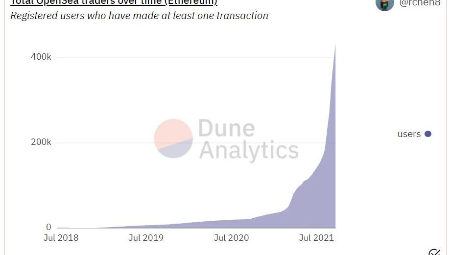 DuneAnalytics記錄的OpneSea以太坊用戶數據始于2018年6月13日,當時的用戶地址數為2個。2019年10月,地址數突破1萬大關。2020年6月,地址數突破2萬。這意味著積累前1萬種子用戶用了16個月。2021年4月,以太坊地址數據突破10萬大關。9月19日,其累計以太坊地址數為43.5萬。