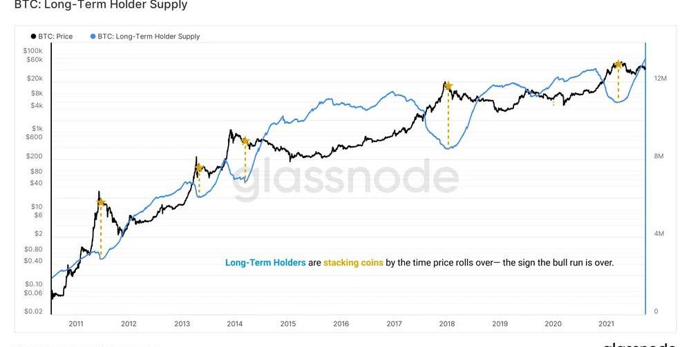 圖3持有波線顯示了隨著時間的推移,代幣在不同時間階段的成熟程度這是一個在比特幣所有歷史——牛市/熊市周期中穩固運行的市場動態:更高的價格帶來更多的需求量,幣被賣給新的投資者。通常是當價格打破之前的高點,并實現收益的市場力量。價格被推高,直到間接供應耗盡需求,市場最終崩潰,通常是迅速崩潰。此時,代幣再次老化,長期持有者供應的數量也在增長。在牛市中,長期持倉者通常會在價格突破之前的高點時轉出頭寸。