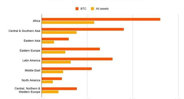 部分歸功于這種最近的增長,沒有哪個地區使用P2P平臺的比例高于非洲加密貨幣用戶,因為它們占所有非洲交易量的1.2%,特別是比特幣的交易量占2.6%。