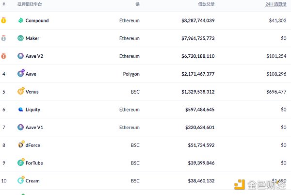 DeFi項目鎖定資產前十排名及鎖倉量,數據來源:Debank