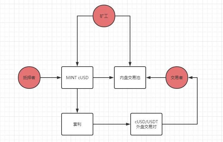B.合成資產的抵押發行模塊也與超額抵押借貸模型存在類似的情況。以同樣的流程圖為基礎:僅需要新增存款池,并且將發行的合成資產債務替換為實際存款池的資金。并且收取額外的借貸利息。
