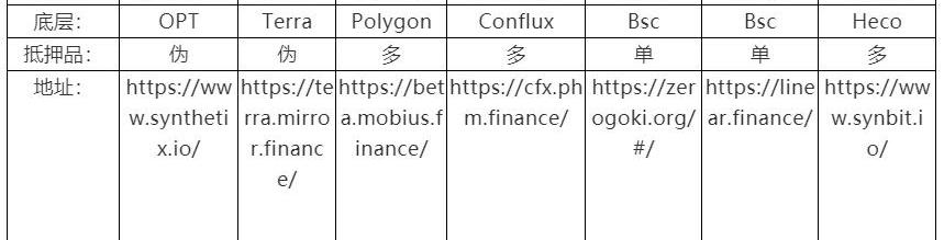 以這種模塊化的思路,我們可以更加清晰的看懂解決方案的思路及影響。2.回溯問題,提出解決方案合成資產項目產品邏輯過于復雜,合約交互成本以及用戶體驗成本都較高。這個問題在當下并不嚴重,雖然回顧Synthetix的sip歷史,會發現Synthetix在降低合約交互成本上提出過很多設想,但是本質問題是layer1的效率太低,成本太高。當主要功能遷移到Layer2或者其他性能更加的底層時,問題不大。且這一點,在新興的合成資產項目上表現明顯。以下匯總了一些先知曾研究過的合成資產項目的情況: