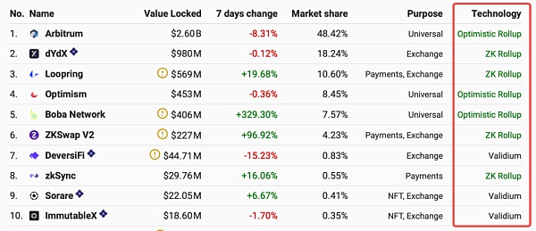 總體來看,Arbitrum后來居上,在生態項目和體量增長上發展迅速,Optimism相對增長較緩,目前主要依賴于Synthetix和Uniswap V3的生態貢獻。當然,除了Arbitrum和Optimism,其它Layer2擴容方案的項目比如ZkSync、Loopring(LRC)、Immutable X(IMX)、Aztec、StarkWare、ZKSwap等同樣取得了一些比較重要的進展。