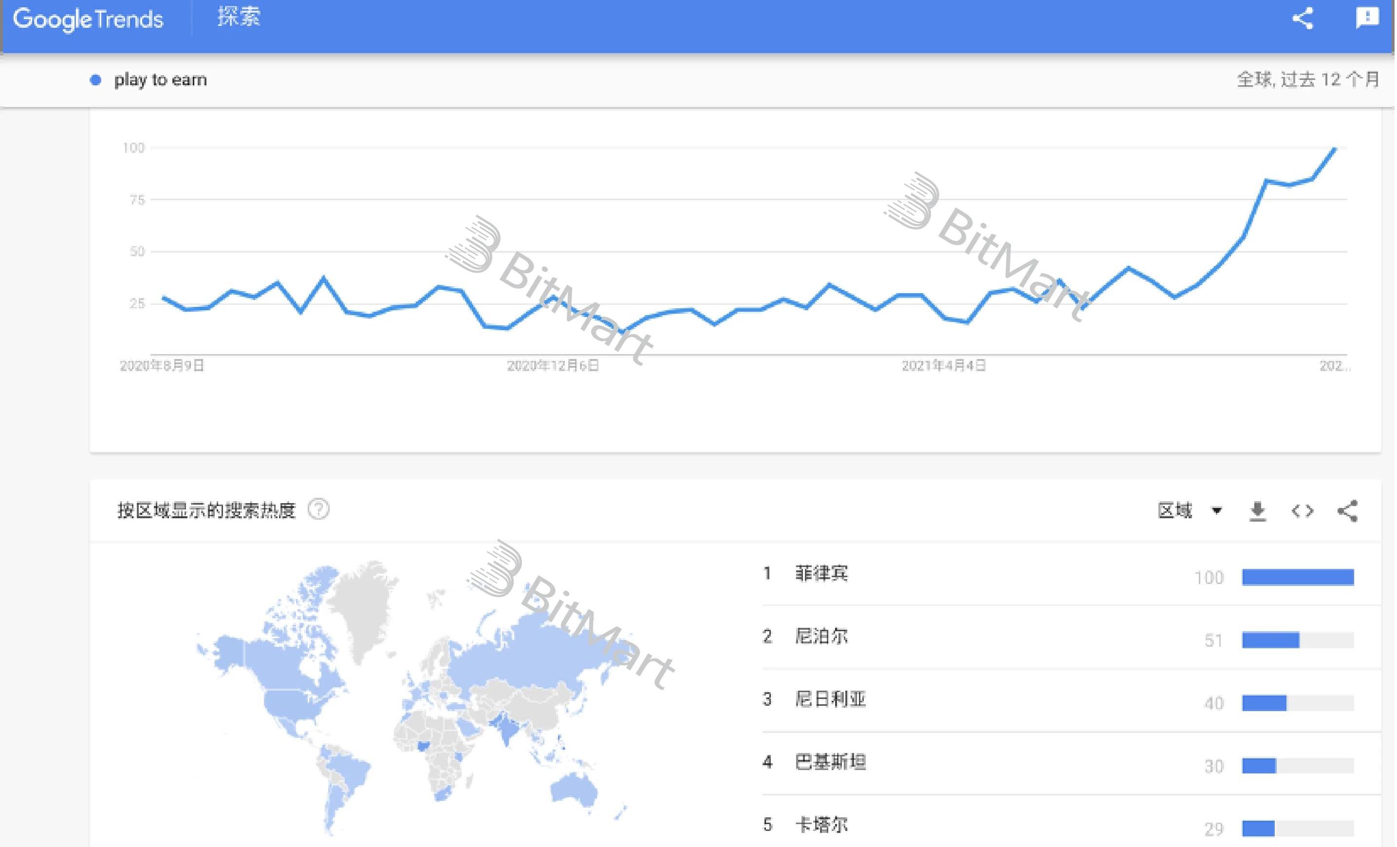 來源:newzoo在google搜索趨勢中,100代表搜索熱度上限,可以看到playtoearn模式熱度從五、六月持續攀升,東南亞和中東地區最為關注。
