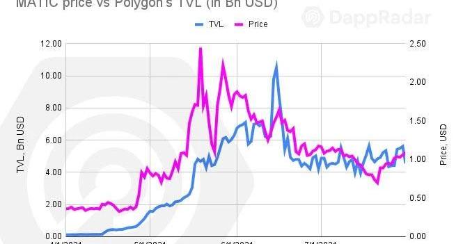實際上,PancakeSwap鎖倉量的優勢地位較前期略有下降,現在大約占幣安區塊鏈上總鎖倉量的38%。另一方面,Venus和AlpacaFinance在鎖倉量方面增長迅速。目前,Venus鎖倉量占幣安總鎖倉量的15%,超31.5億美元,環比增長了25%。而AlpacaFinance現在則以15.8億美元的鎖倉量占據了幣安總鎖倉量的7.25%。此外,側鏈Polygon的總鎖倉量位列第三,價值為45.5億美元,同比增長了8.38%。Polygon區塊鏈中65%以上的鎖倉量來自Aave、Curve和Sushi,他們都充分利用了多鏈范式。另一方面,Polygon上的原生QuickSwap是網絡中使用最多的dApp,該去中心化交易所在7月份吸引了超過161,000名獨立用戶,環比增長11.83%。此外,QuickSwap還產生了45.3億美元的交易量。對于Polygon來說,最有趣的是與前一個月相比,Matic的價格下降了9%。而自6月份以來,該鏈上的用戶增長了24%,使得該網絡獲得了17%的增長。