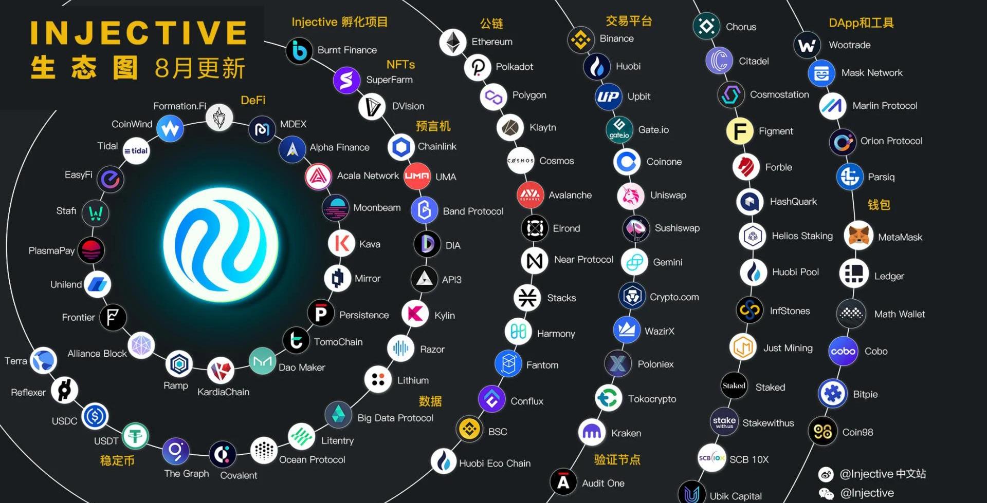 XRP/HKD-3.99%期貨是金融服務行業重要組成部分,也是降低市場風險的最主要形式之一,允許交易者實施更穩固的風險管理策略。Injective正是一個基于以太坊的Layer-2項目,側鏈基于CosmosSDK和Tendermint共識機制,快至1秒的出塊時間,可以極大的提高訂單撮合效率并且支持以太坊跨鏈。為了解決搶先交易問題,通過集成可驗證延遲函數為訂單添加時間戳,杜絕交易作弊,防止礦工「搶跑」用戶。Injective是幣安Labs第一期孵化的八個項目之一,獲得了眾多投資機構支持,包括了全球頂尖的加密貨幣風險投資公司之一的PanteraCapital。整體上,期貨衍生品DEX賽道發展潛力巨大,且訂單簿撮合屬于經典交易模式,一定會在未來市場上占據一席之地。目前已經進入主網CanaryChain階段,合作伙伴在不斷擴展,社區也積累了一定的粉絲體量。生態版圖以肉眼可見的方式開始了極速的擴張,其上層應用場景逐步完善,和以太坊上的龐大生態和各種基礎設施形成密切的合作網絡,處于急速發展和前行的狀態。本文接下來將介紹Injective生態聯盟中的各個主流應用。