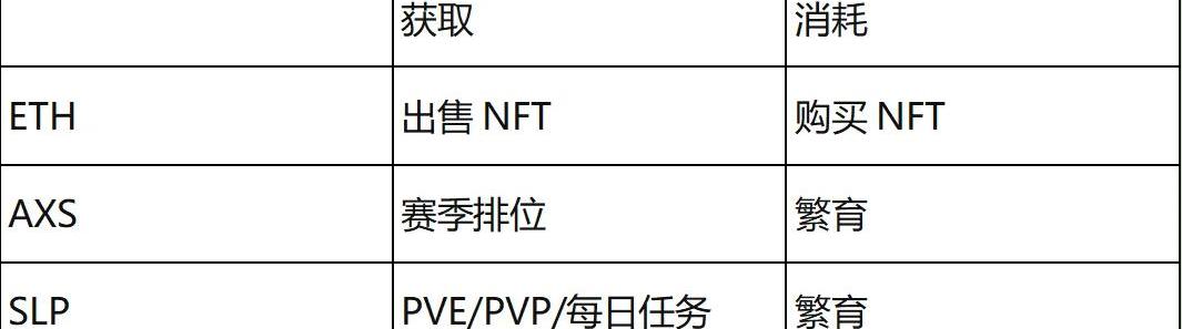 SLP:不論是人機對戰還是玩家對戰都可以獲得“小愛份”(即SLP代幣)獎勵。每天每個賬號的SLP獲得是有上限的。在2021年8月9日修改規則后,每位玩家每天可以通過PVE獲得50個SLP,通過每天完成5場PVP勝利及10場PVE勝利后領取25個SLP,也就是總計75SLP。值得一提的是與傳統手游的體力限制游戲次數不同,Axieinfinity每天的游戲次數是不限的,而每天早8點系統重置給與的20點“體力”則讓玩家在擁有體力的時候通過PVE獲取經驗值或者通過PVP的勝利來獲取超出上線75以外的SLP。而玩家游戲中獲取的SLP則主要用于繁育新一代的AxieNFT或者直接提取賣掉。通過游戲保持每天的SLP獲取并快速的通過產出的SLP達到AxieNFT購入價值是游戲內最主要的盈利模式之一,同時也是吸引大量玩家及資金涌入游戲當中的主要原因。AXS:這是該項目的另一核心代幣之一。游戲中AXS的獲取方式只有一種,那就是通過每個月的排位獎勵。該游戲有一個排名機制,每月獎勵排名最高的玩家一小部分Axie代幣。而除了繁育過程需要消耗4個AXS以外,游戲中沒有其它地方是需要用到AXS的。綜上,所有項目內相關的代幣獲取及消耗如下表: