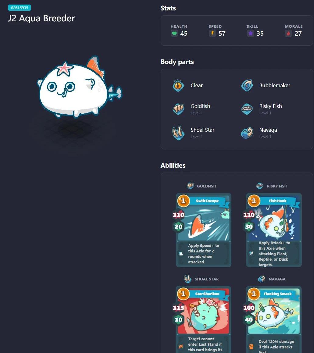 如圖所示,當獸/昆蟲/機甲類的Axie攻擊植物/爬蟲/黃昏類Axie時,攻擊會在原有基礎上增加15%,反之減少15%。當獸系Axie使用同系卡牌時增加10%的攻擊。例:當鳥系Axie使用同系卡牌攻擊獸系Axie時,攻擊值是原有的125%。其中機甲、黃昏、黎明為混雜Axie,沒有同系卡牌,因此使用這3種Axie的玩家較少。生命值、速度、技巧、暴擊對應的4個屬性值的和為164,每個屬性的上限為61,下限為27。生命值:AXIE被擊倒前可能承受最大的傷害速度:技能使用的先后順序,除此之外確定先后手還會按優先級技巧:當寵物一次打出多張卡牌后造成額外傷害暴擊:增加寵物的攻擊暴擊率并有更大的可能進入最后一擊。9個種族的寵物6個身體部位也會對寵物的屬性造成影響,數據如下:植物部位:3生命值+暴擊野獸部位:3暴擊+1速度魚部位:3速度+1生命值蟲部位:3暴擊+1生命值蝴蝶部位:3生命值+1速度鳥部位:3速度+1暴擊其中寵物的嘴,背,角,尾巴四個部位會決定該寵物所擁有的4個技能,技能是游戲中對戰的核心。當然不是所有的寵物的6個部位都屬于自己的種族,當出現其它種族的部位時我們稱之為“變異”