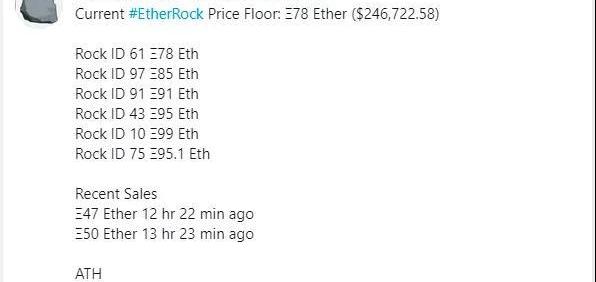 EtherRocks的價格在上周末翻了一倍,而本周一又翻了一倍!根據跟蹤EtherRocks價格的推特賬戶@EtherRockPrice的數據,截止撰文時,目前市場上最便宜的一塊EtherRock石頭已經達到了78ETH,約合246,722美元!有些石頭現在的售價甚至已經達到了99ETH(撰文時約合32萬美元)。而就在幾天前,這些石頭的售價僅約為5萬美元。