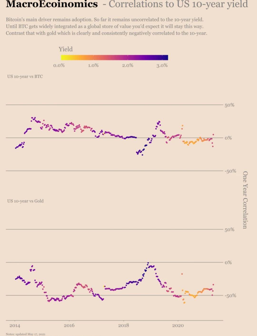 BTC利率和實際債券收益率隨著比特幣在金融機構中的應用越來越廣泛,我們可能會看到實際回報在比特幣的長期趨勢中發揮更重要的作用。但我們還沒有到這個發展階段。目前,比特幣可以作為一種與黃金和債券市場沒有很強長期相關性的資產來享受。