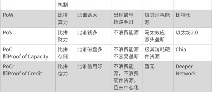 中心化的加密通訊有一個單一的可能出錯的中央服務器,很容易受到黑客的攻擊并且泄露用戶的隱私。而我們的DPN不需要任何月費或年費。購買DeeperConnect并且聯入網絡,可以使用戶成為網絡中的一個節點。我們目前在全球120多個國家擁有12000多個節點。接下來我們討論一下DeeperConnect網絡安全的功能!DeeperConnect還包括企業級的安全網絡。當用戶將DeeperConnect連入網絡時,整個網絡將受到保護,包括所有的物聯網設備。DeeperConnect是一款即插即用的零配置產品,連爺爺奶奶這樣的長輩都可以輕松的使用。同時DeeperConnect的7層防火墻將防止黑客攻擊和跟蹤軟件、阻止惡意軟件和病進入用戶的網絡。隨著越來越多的人擁有加密技術,這一點變得越來越重要。隨著越來越多的人開始在家工作,保護用戶的個人和商業文件不被泄露比以往任何時候都重要。最后,在今年的第三季度,我們將推出DeeperChain主網,用戶可以訪問全新一代的去中心化Web3.0互聯網。Web2.0是由像谷歌和亞馬遜這樣的大公司通過中央服務器集中化控制的,在那里他們可以監視或者關閉任何人的訪問。有了Web3.0,這樣的事情將不復存在。我們在DeeperChain主網上構建了一個圍繞DPR的完整的生態系統,它將允許用戶訪問DeFi產品、NFT商店、DApp商店、去中心化的電子商務和電子服務。DeeperNetwork是基于波卡的Substrate框架構建,為與諸如以太坊、Solana、Cardano等平臺進行高度且輕松的互操作性提供了可能。Web3.0將為許多人打開新世界的大門,而DeeperConnect提供了訪問的網關。最后,我們使用DPR通證來激勵用戶。用戶可以通過共享其未使用的互聯網帶寬來賺取DPR作為回報,這些主網激勵會被發放到用戶的設備錢包中。我們使用了公平的PoCr信用證明共識算法,用戶賺取通證只需要輕松的開關一個按鈕。同時DeeperConnect的設計簡單易用、易于安裝。我們希望全球每個家庭都可以擁有它。到2022年底,我們預計在全球會擁有1000000多個節點。目前對DeeperConnect的需求很高,訂購后的等待時間約為1.5個月。請耐心等待,我們在盡力跟上需求并盡快發貨。Q3:同是Web3.0的網關,人們總是習慣于把Deeper與OrchidProtocol進行對比。新銳的Deeper和老牌的蘭花相比,其競爭優勢在哪里?EricMa:與Orchid相比,我們具有很大的優勢。首先,我們不需要加密貨幣來運行。同時DeeperConnect是一個即插即用的設備,可以很容易的在家里進行設置并且連接到網絡當中。我們的服務是免費且無限的。而Orchid只是一個軟件節點,需要加密貨幣才能工作,并且是一種隨用隨付的訂閱服務。此外,DeeperConnect具有企業級的安全網絡,可以保護用戶的整個家庭網絡安全。就像智能手機成為用戶進入Web2.0的門戶一樣,DeeperConnect也將成為用戶進入Web3.0的門戶。最后,我們還有DPR主網激勵,獎勵為網絡做出貢獻的用戶。目前網絡中已經有20,000多個節點,隨著DeeperConnect節點的增加,網絡也將更加的安全與堅固。Q4:據了解,PoCr共識機制是Deeper獨創,和其他共識機制相比,其優勢有哪些?EricMa:PoCr,全稱ProofofCredit,是Deeper獨創且能夠解決信任問題的去中心化共識機制。它是在PoW和PoS的基礎上發展起來的,同時解決了PoW、PoS等共識機制的缺點,下表是各種共識機制的比較。