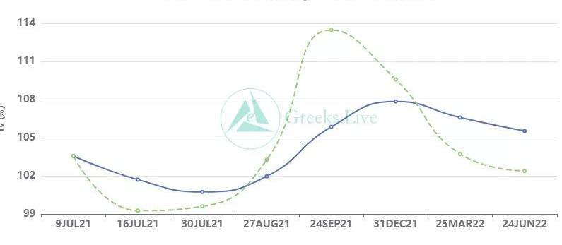 播報數據由Greeks.live格致數據實驗室和Deribit官網提供。在理論中,一般同期限平值期權IV是最低的,但是目前無論是比特幣還是以太坊,都以淺虛值IV最低,這在數字貨幣市場是一個很常見的現象。期權成交量3.16億美元,期權持倉量為44億美元10d110%30d100%90d96%1Y76%各標準化期限隱含波動率:今日:1m92%,3m94%,6m93%,DVol104%6/30:1m87%,3m91%,6m93%,DVol100%一般同期限平值期權IV是最低的,目前當月合約以45000最低,報87%,而季度合約以44000最低,報92%。當然平值和淺虛值期權的IV目前整體比較接近,但是這種結構說明CallSell的力量比較強。