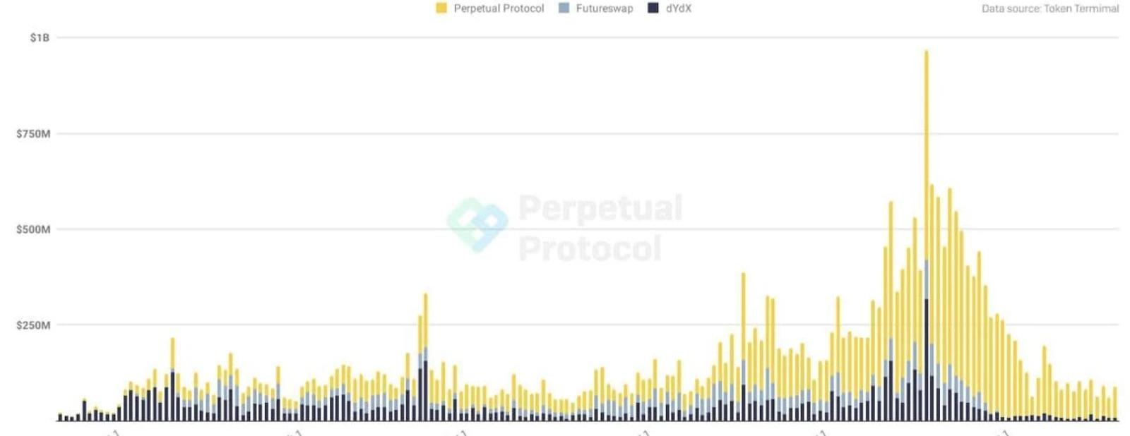 從2020年12月15月永續協議V1主網上線以來,交易量逐步攀升,在197天中取得了190億美元的總交易額。