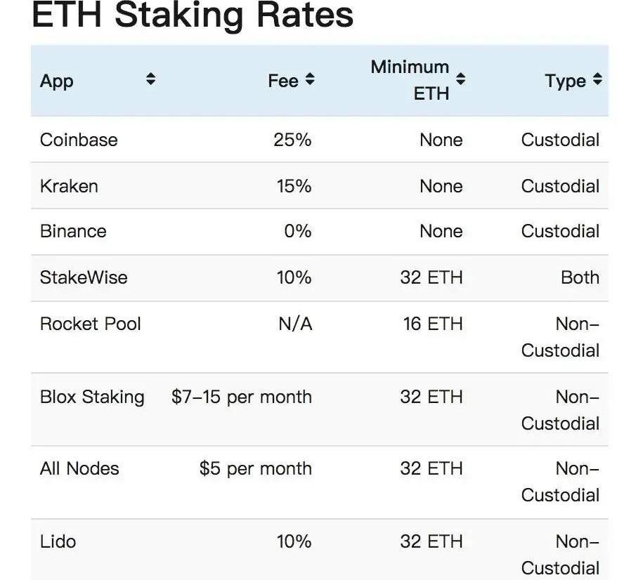 這里的StakingPool是整個Lido智能合約的核心,它負責5件事情:ETH的存款和取款,鑄造和燃燒stETH代幣,將資金委托給節點運營商,分配staking獎勵,接受預言機數據更新。用戶將ETH發送到LidoStaking池子,然后可1:1鑄造出stETH,而存入的ETH將在節點運營商之間分配,以保持均勻分布,并由其驗證器進行驗證。而ETH的取款憑證將設置為分布式托管的門限簽名,以預防單點作惡的可能性。而最后的去中心化Staking服務,代表項目有RocketPool,RocketPool平臺允許任何擁有超過0.01ETH的人參與Staking質押,并為質押者提供1:1的rETH代幣,與Lido不同的是,RocketPool的節點運營商是開放式的,運行一個節點只需要16ETH,是的,相比自己運行一個以太坊2.0節點所需的32ETH,RocketPool對小型節點運營商而言是非常友好的。這些服務該如何選擇?下面是由defirate整理的一些數據: