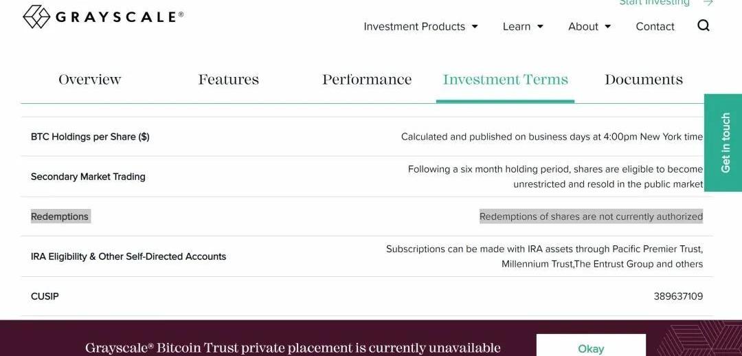 GBTC全稱是GrayscaleBitcoinTrust,是全球最大的比特幣交易加密基金,由加密貨幣資產管理公司GrayscaleInvestments擁有。該投資工具允許個人和機構投資者參與比特幣交易,而無需直接接觸加密資產。經認可的投資者能夠以比特幣或美元支付的形式直接購買該基金的股票,而GBTC在二級市場上有一個鎖定期,時長6個月。投資者只有在六個月的鎖定期后才能向其他各方出售他們的GBTC股票。