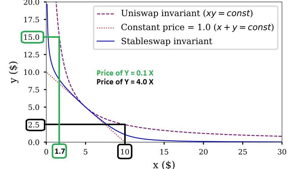 表1:不同的AMM公式會產生不同的價格曲線。假設Uniswapv2流動性池有15個Y代幣時,它只會為邊際Y代幣支付0.1個X代幣。但是當只有2.5個Y代幣時,它會支付4.0個X代幣。其他價格曲線旨在將更多流動性集中在某個價格(例如穩定幣為1.0)。來源:Curve白皮書舉個真實的例子,在撰寫本文時Uniswap的ETH/WBTC交易池中有2,700WBTC和86,000ETH。該儲備率意味著ETH當時的市場價格為2,700/86,000=0.0314WBTC。至關重要的是,AMM不會隨著其他市場的變動而更新此價格。市場價格只會隨著池中代幣儲備率的變化而變化,當有人在其中進行交易時就會產生變化。舉個例子,如果Binance中的ETH價格跌至0.0310WBTC會發生什么?這意味著UniswapLP目前正在以溢價購買ETH,從而創造了套利機會。套利者在Binance上購買“便宜”的ETH,然后在Uniswap上出售以獲利。他們會一直這樣做,直到UniswapETH單位價格變成0.0310WBTC(與Binance相同),他們無法再通過賣出ETH獲利。在我們上面的示例中,這會發生在以17.2WBTC的價格向交易池出售550ETH后(為簡單起見,忽略費用和gas)。因此,即使AMM不會根據現實世界的信息更新其價格,由于持續的套利,交易者仍然可以預期AMM的報價會密切跟進全球市場價格。價格沖擊是什么?