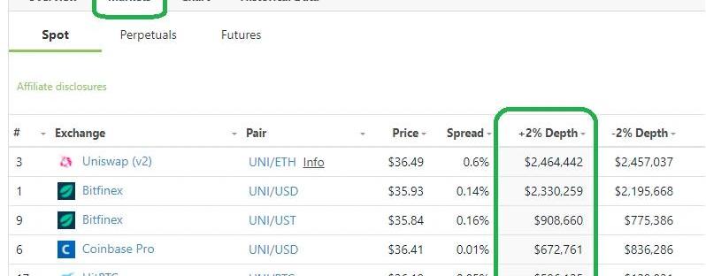 正如我們之前提到的,價格沖擊在交易總執行成本中占很大一部分。以下是一些能夠將價格沖擊最小化的簡單策略:找到深度最好的市場:到目前為止,我們已經確定價格沖擊取決于交易規模在流動性池或市場規模中的占比。因此,我們希望找到在某個價格區間流動性最好的交易池,以使成交價盡可能接近市場價格。Coingecko上的市場深度表是一個不錯的切入點。