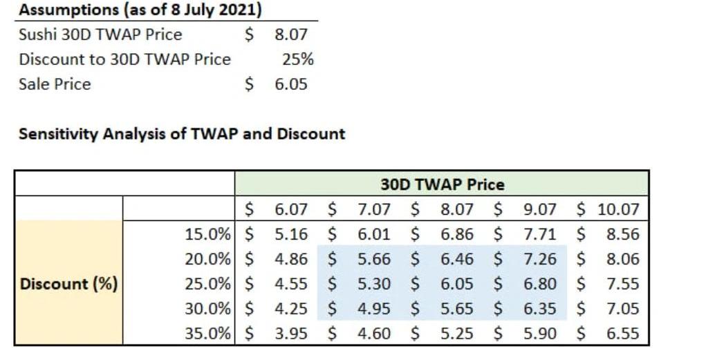 XRP/HKD-1.53%作者|龔荃宇7月8日,SushiSwap聯合創始人0xMaki在官方治理論壇發布提案,作為金庫多元化計劃的一部分,建議將SushiSwap金庫目前持有的約5100萬SUSHI的一部分用于機構投資者,出售規模最高為6000萬美元,出售價格為提案結束前30天的時間加權平均價格的20-30%,歸屬條款則為6個月的鎖定期與18個月的線性釋放期。