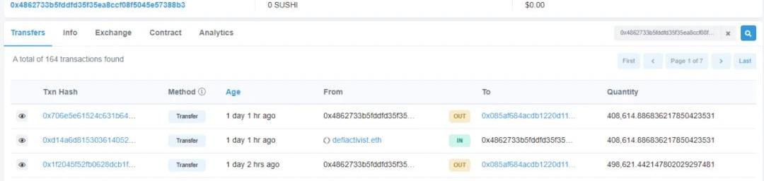 來源:EtherscanDeFianceCapital合伙人Wangarian對此回復稱,DeFiance是Sushi的早期支持者以及目前最大的SUSHI持有者之一,但作為持有流動頭寸的加密投資基金,「我們的工作要求我們不僅要購買代幣,還要偶爾出售它們。我們認為沒有必要向公眾解釋我們采取的每一項行動。」Wangarian還表示,DeFiance將不會參與此次融資,以消除任何利益沖突的擔憂。「我們希望Sushi社區認識到以穩定幣計價的大型金庫的好處,這將在未來幾年為SushiSwap團隊提供有意義的財務火力。」除了前述質疑外,由于前幾天DeFi教育基金通過Uniswap社區投票獲得100萬UNI卻很快拋售的事件也引起部分SushiSwap用戶的反思,擔憂風投機構們正在為了自己的利益濫用治理。「在UNI教育基金之后,我們在如此短的時間內得到了這個提議。我想說這并非巧合,風險投資基金意識到他們可以為自己的目的濫用治理。只需打開一個治理提案并使其看起來合法,而VC可以用他們龐大的SUSHI持倉將每一張選票都投給他們。」名為「Wunderbernd」的用戶回帖表示,「沒有任何機制可以確保VC真正履行其承諾。他們可以以折扣價獲得SUSHI,而實際上并沒有被迫做任何事情。這再次類似于DeFi教育基金,他們得到了錢,他們可以為所欲為。」7月16日,0xMaki在提案帖子中回復稱,根據社區的整體反應,將把交易規模從6000萬美元降低到1500-2000萬美元,同時針對代幣出售細節發起了多項投票。「很少看到機構和社區治理之間的這種程度的互動,以及這些機構如何通過開放討論與DAO互動的關鍵時刻。」0xMaki同時也對此次事件的意義進行了評價。或許是受社區活躍度的影響,今日SUSHI代幣價格在市場整體行情回落的情況下,最高上漲約16%,截至發稿時報價7.04美元,但仍然較年內高點下跌約68%。目前,針對該提案的討論仍在進一步發酵,Uniswap創始人HaydenAdams、Compound創始人RobertLeshner、YFI創始人AndreCronje、Messari創始人RyanSelkis、BlockTowerCapital創始人AriPaul等諸多行業知名人士都在推特談及此事。無論該提案最終的結果如何,SushiSwap的代幣出售提案已經成為加密社區討論最為充分的提案之一,社區成員大規模施壓迫使項目方修改其提案細節,計劃相關的風投機構則公開舉證陳述其理念與戰略價值以迎合社區,或將成為DeFi治理史上最為經典的案例之一。