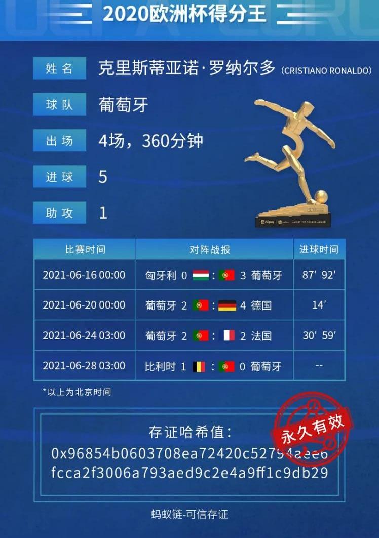 C羅獲得區塊鏈得分王金杯如圖所示,C羅所獲得的區塊鏈獎杯有著獨一無二的存證哈希值,即便百年之后,人們依然可以在區塊鏈上瞻仰這一歷史時刻。與此同時,在射手榜分列二、三位的捷克隊希克、法國隊本澤馬分別獲得銀杯和銅杯,他們的獎杯也是由螞蟻鏈提供技術支持的區塊鏈獎杯。這是歐洲杯歷史上首次發放區塊鏈獎杯。不僅如此,歐足聯(UEFA)還表示,三位球員的進球瞬間,將通過螞蟻鏈技術,生成歐洲杯史上第一份數字藏品,被歐足聯永久收藏。區塊鏈數字藏品已不再是一個生僻概念,它的載體是NFT,在過去的大半年里,各種數字藝術品、NBA球星卡以數字化形式生成在鏈上,成為獨一無二的數字化藏品。如今,在歐洲杯這樣的全球頂級足球賽事上,NFT又一次露了臉。提供這些精彩進球瞬間NFT的技術底層是螞蟻鏈。在歐洲杯賽事舉辦期間,很多球迷已經發現,「螞蟻鏈」的字樣出現在賽場邊的廣告牌上。根據螞蟻鏈公告,今年6月10日,螞蟻鏈成為了2020歐洲杯官方全球合作伙伴。其與歐足聯簽署了一項為期五年的合作協議,為的是探索用區塊鏈等技術加速足球產業數字化轉型,改善全球球迷的觀賽體驗。當足球遇上區塊鏈,到底能擦出怎樣的火花?據透露,在歐洲杯結束后,螞蟻鏈的同宗產品支付寶還向1600位實名用戶發放得分王同款數字獎杯,以獎勵在歐洲杯競猜活動中勝出的用戶。這些數字獎杯是實體獎杯的單個復制品,記載的寓意是無論身份地位,每個人都能享受足球快樂,并成為「得分王」。當區塊鏈獎杯、精彩進球瞬間的NFT等新元素出現在足球世界時,這一傳統體育運動擁有了頗具科技氣息的衍生周邊。多種NFT產品現身螞蟻鏈