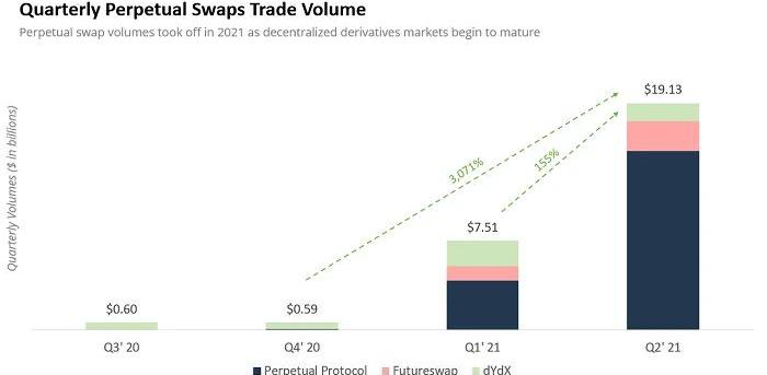 去中心化衍生品交易量在2021年第二季度繼續大幅增長,盡管仍然只是去中心化現貨交易量的一小部分,但本季度永續掉期合約交易量達到近200億美元,比2020年第四季度增長了3,000%,比2021年一季度增長155%。盡管目前存在擴展障礙,但去中心化衍生協議已經開始受到更多DeFi用戶的關注。