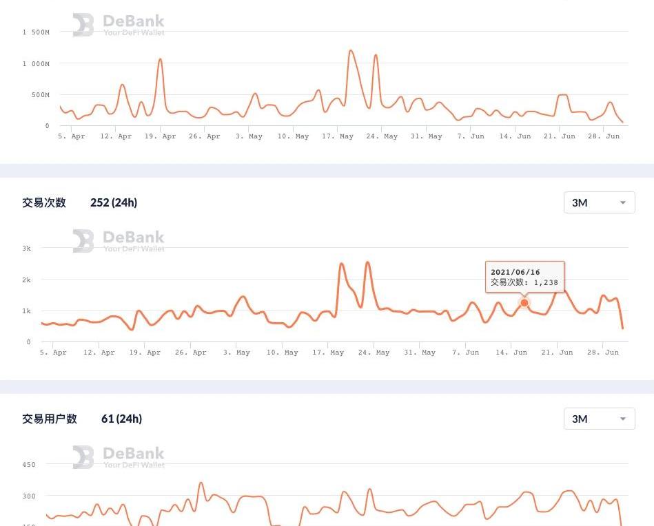 (圖片來源:launchpad.ethereum.org)在DeFi數據方面,受整體行情影響,DeFi遇冷下挫,交易量和用戶量均呈現下降趨勢。據Debank數據顯示,DeFi協議總鎖倉量709億美金,其中,以太坊的Curve鎖倉83億美金位列首位,但數個交易緯度都呈現下降趨勢,其也大致反映了現階段DeFi協議的整體行情。同時我們也發現,以太坊二層擴容方案Polygon的生態發展迅猛,排名靠前的DeFi協議中,已經出現了數個基于Polygon鏈開發的協議身影。這也側面反映出,二層網絡已經在解決以太坊性能困局和行業采納普適性方面發揮作用。