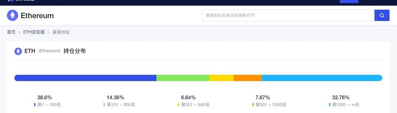 歐科云鏈OKlink數據顯示,目前ETH持倉前300名,掌握了總計52.96%的ETH,環比上漲0.35%;此外,整個持倉分布呈現橢圓形結構,各個部分占比分別是:第1~100名,占比38.6%,環比上漲0.44%;第101~300名,占比14.36%,環比下降0.09%;第301~500名占比6.64%,環比下降0.09%;第501~1000名,占比7.67%,環比下降0.06%;第1001名后,占比32.76%,環比下降0.15%。三、生態與技術